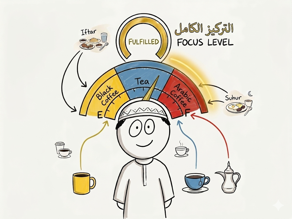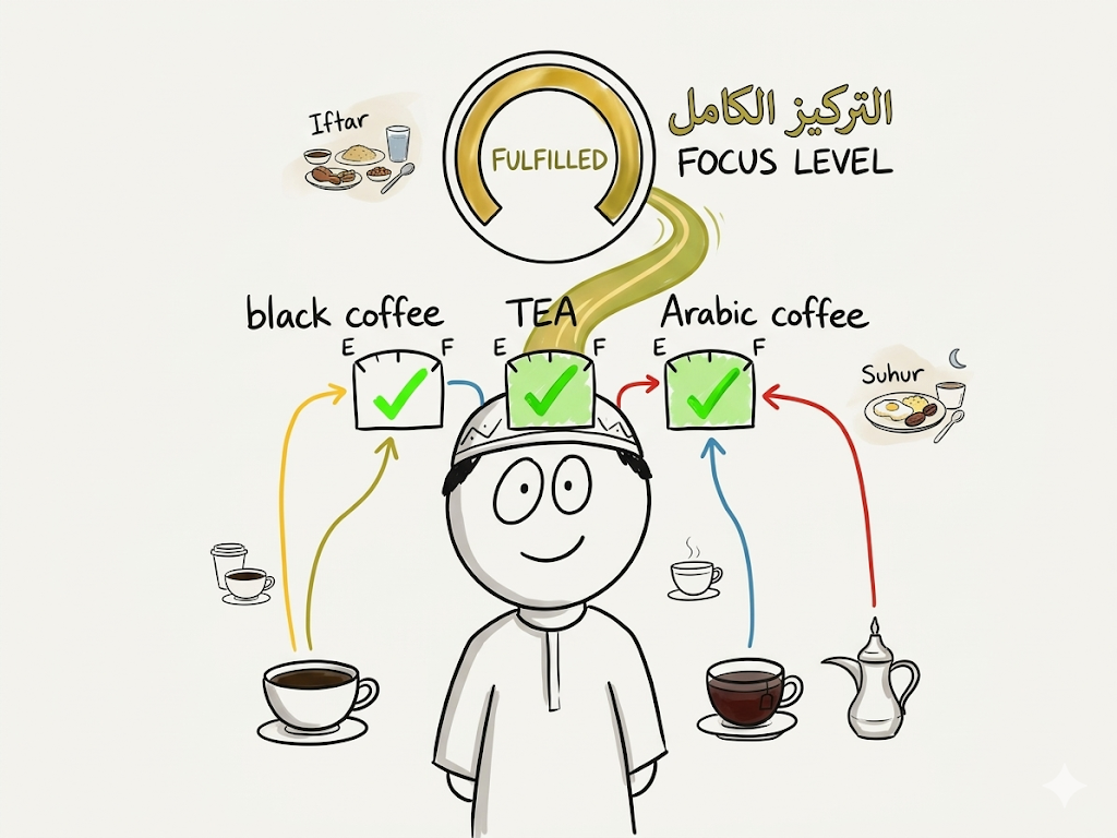 خلال رمضان المبارك تصيبني حالة بعد الفطور، حيث إني أكون خاملًا حتى أفطر على قهوة سعودية، أشرب شاهيًا ومن ثم أشرب قهوة سوداء. عندي إحساس أن كل هذه المشروبات المختلفة تضرب خطوط كافيين مختلفة ولا أحد منها يعوض عن الثاني.