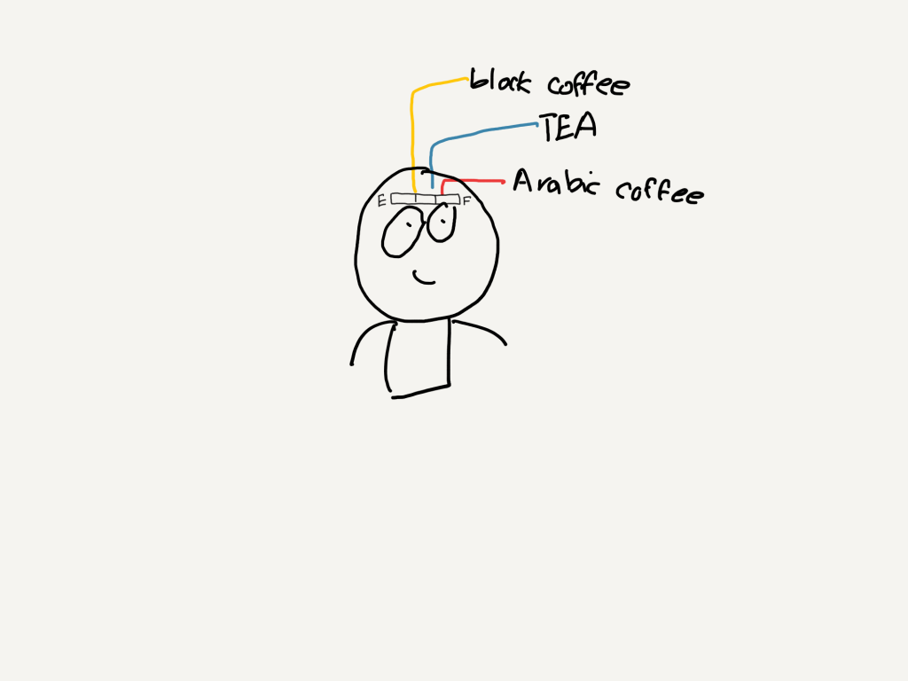 “I did this comic. I am trying to describe caffeine ingestion for Muslims in Ramadan. Basically how to reach full focus only if you take tea, black coffee, Saudi coffee
