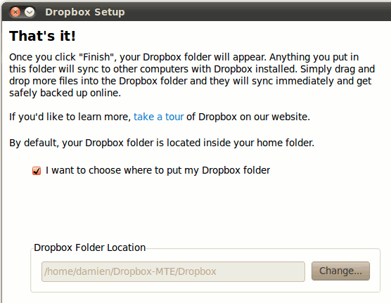 الأمر السابق اننا قمنا بتمرير لبرنامج الدروب بوكس قيمة أخرى لمتغير الـHOME , لو أننا نقوم بتثبيت برنامج الدروب البوكس للمرة الأولى لما إحتجنا إلى ذلك, ولكن هنا نقوم بخداع ” قوية خداع 😛 ” برنامج الدروب البوكس ونخبره بأن المجلد الإفتراضي لمستخدمي هو .dropbox-mte , طبعاً يمكن أن يكون أي مجلد, هذا راجع لك.